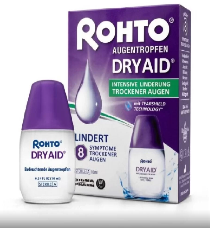 Rohto Dry Aid göz damlası, 10 ml hacmi ile gözlerinizi nemlendirir ve ferahlık sağlar.